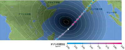 共同研究チームが国際宇宙ステーション(ISS)に搭載された超伝導サブミリ波リム放射サウンダ(SMILES)の高精度な観測データを用いて、2010年1月15日に起こった日食時のオゾン量の変化を調べた結果、月の影で暗くなっている地域では、明るい地域に比べて、中間圏のオゾン量が多くなっていることがわかりました(図)。またその変化の様子は地表からの高度によって異なっていることもわかりました。本研究は日食を利用することによって、太陽光量の変化のみが大気中のオゾンに与える影響を示した重要な成果です。