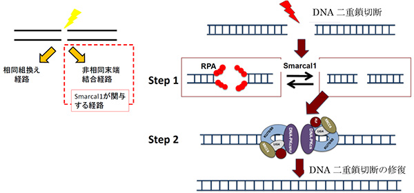 左図に示したように、二重鎖DNAの切断は、二つの経路(相同DNA組換えとDNA非相同末端結合経路)によって修復されます。今回本研究グループではSmarcal1蛋白質が非相同末端経路に重要な機能を担っていることを明らかにしました。右図に示したように、二重鎖切断の末端は開いたり(Step1、左側)閉じたり(Step1、右側)しています。本研究グループが解明したことは、Smarcal1が、二重鎖DNA切断の末端を閉じた形状に戻し、非相同末端結合に必要な修復蛋白質群の結合を促進し、二重鎖DNA切断の修復(切断の再結合)を促進することです。