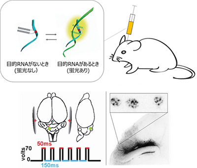 新しい標識法の概要。目的RNAの有無により、蛍光のオン・オフができるプローブを組織に打ち込み、電流を流すことで、細胞内にプローブを導入する。この標識法で、今まで見えなかった生きた組織内での細胞内RNAの集まりが観察できるようになった。右下の図では、小脳の細胞核内で顆粒状に局在するRNAの様子が示されている。