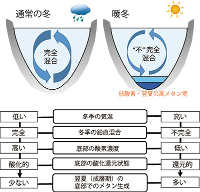 結果、暖冬時には不完全な混合のため、底層まで酸素の供給が行き届かず、貧酸素状態が底部で継続することが観測されました。この貧酸素状態の継続が、暖冬の翌夏の底層メタン生成に影響し、その前の夏に比べメタン濃度が3~4オーダーも高くなることが明らかになりました(図)。
