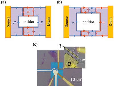 図(a)はpn接合が偶数個のとき、(b)は奇数個のときの量子ホール端状態を流れる電流を示しています。この二つ場合の伝導度が質的に異なることを本研究では報告しています。(c)はパリティ実証に用いたグラフェン試料の光学顕微鏡写真です。拡大図の白線で囲んだ部分がアンチドットを持つグラフェン(グラファイト)で、αとβがトップゲート電極です。この試料ではpn接合が0、1、2、3本の場合を実現できます。