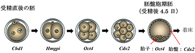 受精直後にChd1をRNA干渉(siRNA:small interfering RNAを受精卵に顕微注入して、目的の遺伝子を抑制する方法)と呼ばれる方法で抑制すると、胚盤胞期までの発生過程において形態的な異常は全く観察されませんが、着床後に異常が起こり産子に至る率が著しく低下することが明らかになりました。Chd1を抑制した受精卵にHmgpiのmRNAを同時に顕微注入すると産子に至るまでの発生能が回復しました。以上のことから、受精直後のChd1がHmgpiの発現を介して、正常な産子に至るまでの遺伝子発現を制御していることが明らかになりました。
