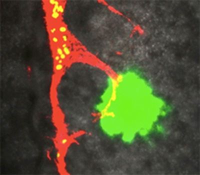 人工的に与えたFGF8(緑)によって誘引される、腎管の先端細胞(赤)