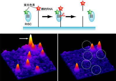多田隈尚史 物質-細胞統合システム拠点(iCeMS)特定研究員、上田卓也 東京大学新領域創成科学研究科教授、泊幸秀 同分子細胞生物学研究所教授らの研究チームは、1分子イメージング技術を用いて、RISCが標的RNAを切断する過程を分子1個のレベルで観察することに、初めて成功しました。これは、RISCが標的を切断する仕組みを解き明かす画期的な研究成果であるとともに、現在進められているRNAiを利用した次世代医薬品の開発など、RNAiのさらなる応用を加速することが期待されます。