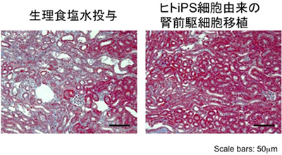本研究グループは今回、ヒトiPS細胞からOSR1とSIX2という二つのタンパク質を発現している腎臓の前駆細胞へと分化させ、虚血性の腎障害を起こしたマウスの腎被膜下へ移植し、治療効果を検証しました。