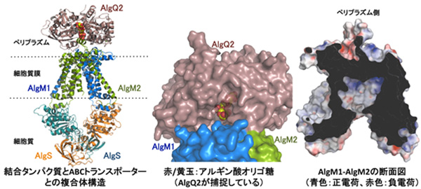 左:アルギン酸結合タンパク質(AlgQ2)とABCトランスポーター(四量体:AlgM1-AlgM2/AlgS-AlgS))との複合体の立体構造 中:結合タンパク質とABCトランスポーターとの界面に横たわるトンネル構造と結合タンパク質の突きあたりまで入り込んだアルギン酸(中央の黄色)を示す。右:ABCトランスポーターの断面(黒影の部分)。その背後の空間にアルギン酸と相互作用するアミノ酸が配置されている。