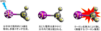 X線をヨウ素原子に照射すると、ヨウ素原子の深い(エネルギーが高い)内殻軌道から電子が放出されて、ヨウ素原子はエネルギーが高く不安定な原子イオンになります。この不安定な原子イオンは比較的浅い(エネルギーが低い)軌道の電子を次々に放出することで安定化し、多価原子イオンになります。SACLAの非常に強力なX線パルスを照射すると、このような過程が10フェムト秒のX線照射時間の間に複数回起こり、非常に多価のイオンが生成します。ヨウ素原子が分子の中に含まれる場合でも、X線を照射すると分子中のヨウ素原子は同様に非常に多価のイオンとなり、正の電荷は速やかに分子全体に再配分されます。電荷が再配分されると、それぞれの原子が電荷をもつため、原子イオン間のクーロン反発力によって、分子はバラバラになって飛び散っていきます。この現象はクーロン爆発と呼ばれています(図)。