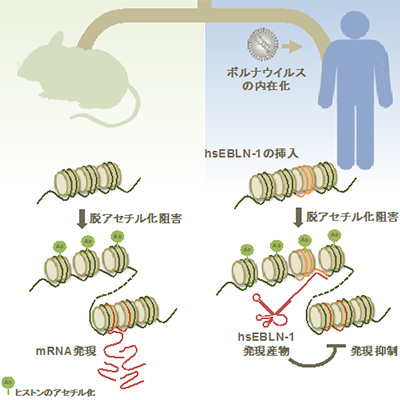 生物は、感染したウイルス遺伝子をゲノムに組み込むことで進化してきたと考えられています。これまでに、生物のゲノムに組み込まれたウイルス遺伝子の生物ゲノムへの影響は、レトロウイルス以外では知られていませんでした。これまで研究グループでは、レトロウイルス以外のRNAウイルスであるボルナウイルスが、ヒトをはじめとする多くの生物ゲノムに内在化していることを明らかにしていました。