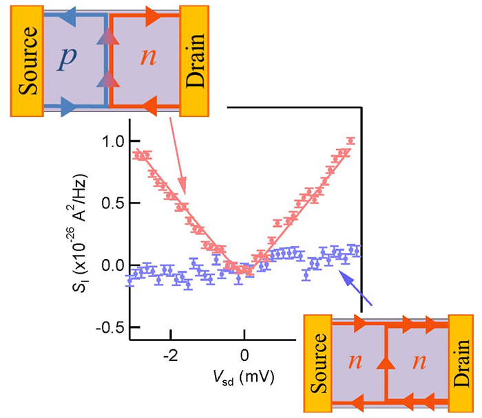 図: ショット雑音の測定結果。 pn 接合のある場合(赤いデータ)は電子分配過程があるためショット雑音が生じるが、 pn 接合のない場合(紫のデータ)ではショット雑音が生じない。