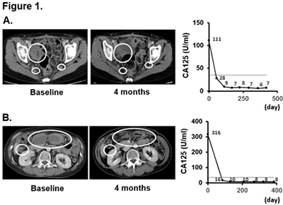 (B) 60歳、卵巣明細胞癌、腹膜播種再発症例(白丸)。ニボルマブ投与4か月で完全奏効し、CA125も基準値内に低下した。