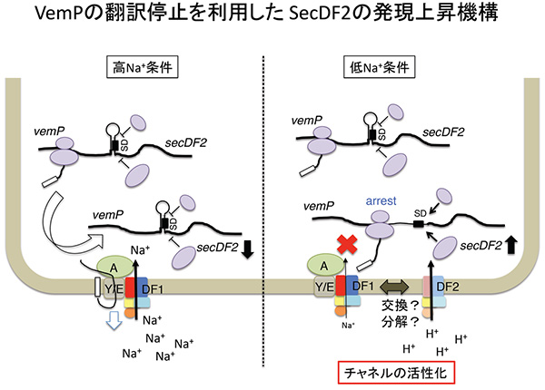 (左)高食塩環境では、Na + 濃度勾配エネルギーを利用してSecDF1が十分に機能できるため、VemPタンパク質の翻訳停止は一過的であり、SecDF2の合成は抑制される。(右)低食塩環境下では、Na + 濃度勾配の減少によりSecDF1の機能が低下し、VemPの分泌能も低下する。その結果VemPの翻訳停止状態が安定化し、mRNAの特徴的な二次構造がほどけた状態が持続する。SecD2に対するSD配列(リボソーム結合部位)が露出し、SecDF2の合成量が増加する。SecDF2はSecDF1と置き換わり、H + 濃度勾配を利用できる新しいタンパク質の膜透過装置が再構築される。