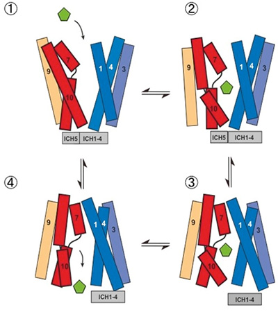 - 果糖が結合することによって、へリックス7の上半分とへリックス10の下半分が動いて果糖を取り囲む。このとき、へリックス4とへリックス10の下端は近い位置にあり細胞内側のゲートが形成されている。