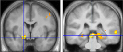 閾下条件で特に、それた視線に対する強い活動。無意識で視覚情報を処理する経路と提案されている扁桃体(左)と上丘(右)が活動した。