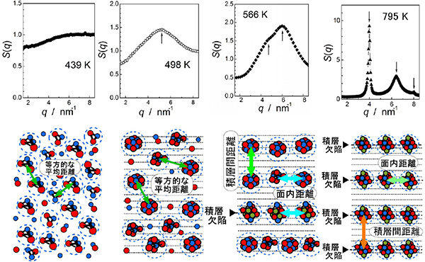 Mgのhcp格子中にクラスターが形成・成長し、最終的にクラスターの格子が形成される様子。上はクラスター間距離の分布を示すピークの変化 詳しい研究内容について