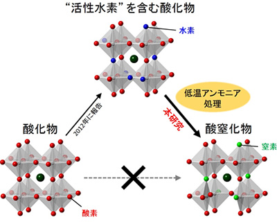 本研究の概略図。「活性水素」(ヒドリド)を含む酸化物(中央)をアンモニア気流中、低温処理(375から500度)することにより、水素と窒素の交換反応が進行し、新しい酸窒化物(右下)が得られる。従来、低温アンモニア処理では試料表面のみしか窒素化できないと考えられていた。また、安定な酸化物(左下)から酸窒化物は得られない。