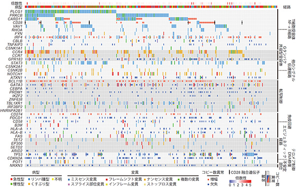 - 今回同定された異常は、PLCG1、PRKCB、CARD11、VAV1、IRF4、FYN、CCR4、CCR7などの機能獲得型変異、CTLA4-CD28、ICOS-CD28などの融合遺伝子、CARD11、IKZF2、TP73などの遺伝子内欠失などからなります。これらの異常は、T細胞受容体シグナルの伝達をはじめとする、T細胞の分化・増殖などのT細胞の機能に深く関わる経路や、がん免疫からの回避に関わる経路に生じており、こうした異常によって正常なT細胞の機能が障害される結果、T細胞のがん化が生じてATLの発症に至ると考えられました。