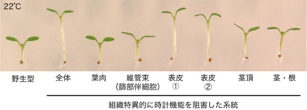 表皮を含む組織で時計機能を阻害した系統でのみ、22度で胚軸(茎)が伸びている。花芽形成に表現型がみられた維管束・篩部伴細胞の時計は細胞伸長に影響しない。