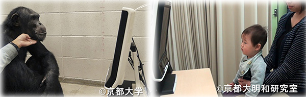 アイトラッカーを用いたチンパンジー成体(左)とヒト12か月児(右)の実験風景