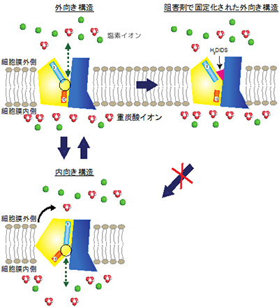 バンド3は、赤血球の外側に開いた状態で、阻害剤が結合し全体の立体構造を安定化している。この外向きの状態に、血液中の塩素イオン(緑色のボール)がバンド3のコアドメイン(黄色)に結合し、コアドメインが動くことで赤血球内に塩素イオンが取り込まれる。重炭酸イオン(白と赤のボール)は塩素イオンの代わりにバンド3に結合し、コアドメインが動くことで、重炭酸イオンが赤血球の外に放出される。