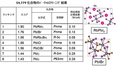 構造既知の全無機化合物結晶についてのバーチャル・スクリーニングによるランキングの上位と、実際に高精度計算によって確認された超低熱伝導度物質