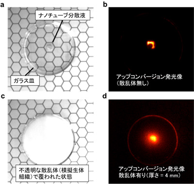 (a)透明なガラス皿の底に敷き詰めた樹脂中に、封じ込めて配置されたカーボンナノチューブ分散溶液(ガラス皿中心部)の写真。比較のため、黒い蜂の巣模様が印刷された紙の上に載せて撮影。(b)同じ試料のアップコンバージョン発光画像。カーボンナノチューブの発光だけがクリアに観測されている。背景の紙や、蜂の巣模様に印刷されたインクからの発光は観測されない。(c)生体組織を模した光散乱体で覆われたガラス皿の写真。光散乱体は可視光領域では完全に不透明であり、背景の模様も見えなくなっている。(d)光散乱体(厚さ4ミリメートル)の後ろに置かれたカーボンナノチューブ分散液のアップコンバージョン発光画像。近赤外光の高い透過性により、散乱体があっても、カーボンナノチューブからの発光が鮮明に観測できる。(b)と(d)における照射光の波長は1064ナノメートル、光強度は約6ミリワット/平方センチメートル。シリコン製の電子増倍型冷却CCDカメラを用いて撮影