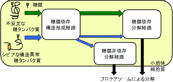 不安定な糖タンパク質は糖鎖依存構造形成経路に入った後、糖鎖依存分解経路で分解される。一方で、シビアな構造異常糖タンパク質は、糖鎖依存構造形成経路に入った後、糖鎖依存分解経路または非依存分解経路で分解される。