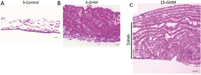 A:単純に心臓組織シートを5枚重ねたもの。細胞が失われボロボロとした構造になり、厚みも薄い。B:心臓組織シートの間にゼラチンハイドロ粒子を挿み込みながら5枚重ねたもの。C:心臓組織シートの間にゼラチンハイドロ粒子を挿み込みながら15枚重ねたもの。いずれも細胞は正常に生き残っており、1mmを超える構造を作ることができている。右下のスケールバー:50μm(A、B)、100μm(C)