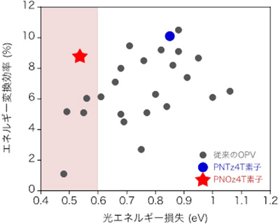 従来のOPVの多くは光エネルギー損失が0.7eV以上と高い。光エネルギー損失が小さくなるに連れ、エネルギー変換効率は減少傾向にあるが、その中でPNOz4T素子は特異的にエネルギー変換効率が高い(ピンク色の領域は光エネルギー損失が無機太陽電池と同程度に小さいことを示す)。