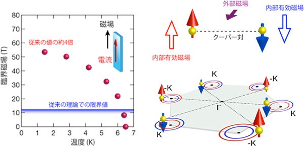 (左)最低温での臨界磁場は50テスラを超え、従来の理論での限界値の4倍の大きさになっている。(右)超伝導電子対は、面内の対称性の破れに起因する約200テスラの内部磁場によって、層に垂直な方向に固定されているため、層に平行な方向の外部磁場を加えてもその超伝導状態が維持される。下の図は、波数空間での超伝導対形成の様子