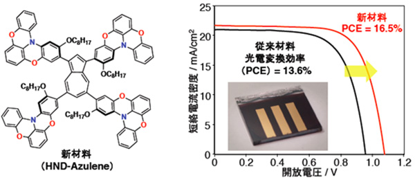 開発した座布団型半導体材料(HND-Azulene)とペロブスカイト太陽電池特性