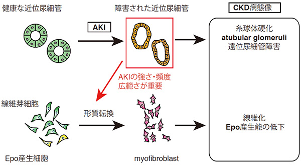 AKIにおいては、腎臓の機能単位ネフロンの近位尿細管という部位が障害されますが、CKDでは広範なネフロン障害と線維化、腎性貧血が特徴となっています。AKIがCKDに移行することは疫学的には確立されていますが、AKIの主因である近位尿細管障害が広範なネフロン障害と線維化、腎性貧血を特徴とするCKDを惹起するメカニズムは明らかにされていませんでした。