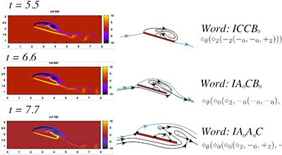 流れの極大語表現と正規表現の例: (左)数値シミュレーション結果(中央)シミュレーションから抽出された流れパターン (右)パターンの極大語表現(上)と正規表現(下)