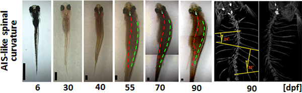 内在性エンハンサーを用いてモザイク状にlbx1bを発現させると、椎骨奇形を伴う側弯や体軸が弯曲するAISに似た側弯(写真、右端2枚はX線マイクロCT画像)を示すことが観察された。
