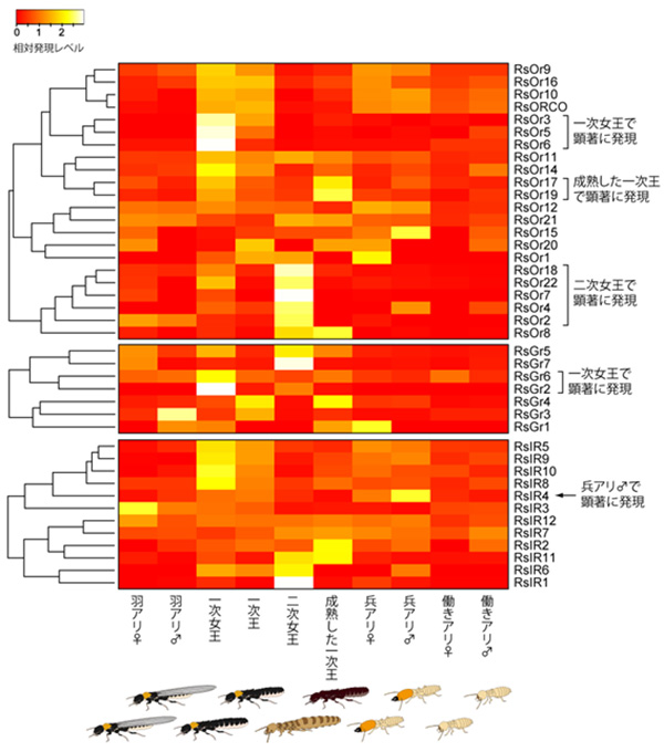 その結果53種類の遺伝子が見つかり、そのうち41種類が化学受容体(嗅覚受容体22種類、味覚受容体7種類、イオノトロピック型受容体12種類)であり、12種類が輸送タンパク(匂い分子結合タンパク9種類、化学感覚タンパク3種類)であることがわかりました。これら53種類の遺伝子のうち、約81%は発現量にカースト間差が見られ、約8%は性差が見られました。また、いくつかの遺伝子は、王または女王でのみ顕著に発現するパターンを示しました。さらに、全体の約62%の遺伝子は、王または女王の年齢に応じて発現量が変化していることが示唆されました。