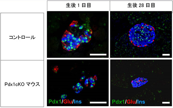 川口義弥 iPS細胞研究所(CiRA)教授、児玉創太 地域医療機能推進機構滋賀病院医長(元医学研究科研究生/CiRA研究員)、中野泰博 東海大学医学部特定研究員(元医学研究科博士後期課程学生)、平田耕司 CiRA研究員/医学研究科研究生らの研究グループは、外分泌組織が極端に少ないマウスを作成して解析したところ、内分泌組織の分化・成熟が阻害され、糖尿病になることを示しました。