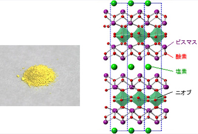 本研究にて見出した酸塩化物光触媒の写真(左)と結晶構造(右)