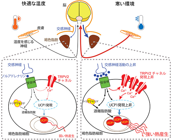 今回、本研究グループは、褐色脂肪細胞の細胞膜に存在するタンパク質の一種で細胞内へカルシウムを投下する役割を担うTRPV2チャネルに注目し、このTRPV2チャネルが褐色脂肪細胞に特に多く発現していること、そして寒い環境下ではチャネルの発現量が多くなることを発見しました。また、TRPV2チャネルは、冷たい刺激にさらされた際、熱産生を担うために増加する分子であるUCP1の発現量に関わっていることがわかりました。