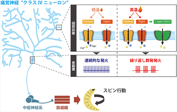 痛覚ニューロン自身が積極的に発火パターンを調節することで、個体の行動パターン選択を制御している。