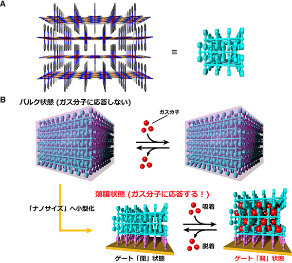 今回の研究では、通常の大きな結晶(バルク)状態では分子を全く吸わない多孔性金属錯体(MOF)が、非常に薄いナノメートルサイズの結晶性薄膜になると分子を吸うようになることを発見しました。分子を取り込み、放出する際に薄膜があたかもゲートを開閉するように動いていることを大型放射光施設SPring-8でのX線回折実験からクリアに確認することが出来ました。この発見は、MOFの結晶サイズの変化が物性に劇的な変化をもたらし得ることを示しており、これまで実用性が無いと思われていたMOFでもサイズ次第で有用になる可能性がありますし、膜の厚みを自在にコントロール出来る薄膜合成の長所を生かすことで、将来的にセンサー材料やガス分離膜等への応用につながることが期待できます。