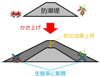 日本の沿岸部では、巨大地震による津波に備える巨大防潮堤の建設や気候変動による高波・高潮被害の増加に関する検討が進められています。しかし、防潮堤の建設は周辺の生態系の劣化も同時に引き起こす可能性があります。東北大学・九州大学・京都大学の研究グループは、文部科学省「気候変動リスク情報創生プログラム」の一環として、2014年1月から2月に全国の沿岸自治体に居住する20代から60代の男女(有効回答7,496人)を対象にwebアンケートを実施し、防潮堤のかさ上げと沿岸生態系の維持との間のトレードオフに関する意識調査(選択実験)を行いました。
