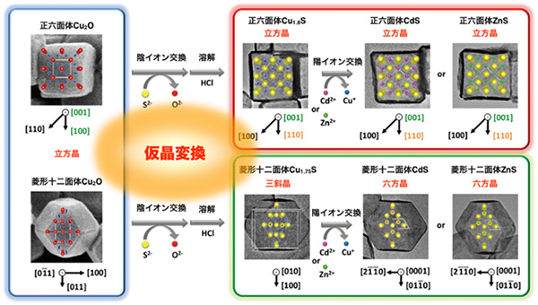(上段){100}面が露出した正六面体Cu 2 Oナノ結晶(立方晶)の陰イオン交換(O 2- → S 2- )およびCu 2 Oのエッチングにより中空状正六面体Cu 1.8 Sナノケージ(立方晶)が得られ、引き続き陽イオン交換(Cu + → Cd 2+ , Zn 2+ )を行うと正六面体CdSやZnSナノケージ(いずれも立方晶)が得られる。(下段){110}面が露出した菱形十二面体Cu 2 Oナノ結晶(立方晶)の陰イオン交換(O 2- → S 2- )およびCu 2 Oの溶解により菱形十二面体Cu 1.75 Sナノケージ(三斜晶)が得られ、引き続き陽イオン交換(Cu + → Cd 2+ , Zn 2+ )を行うと菱形十二面体CdSやZnSナノケージ(いずれも六方晶)が得られる。