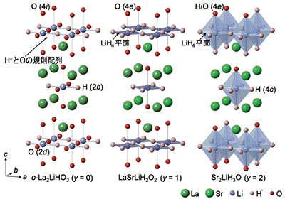 H - 含有量の増加に伴い、Liと陰イオンで形成される八面体内の配位環境が変化する。La 2 LiHO 3 ではLiにH - が直線的に二配位する。LaSrLiH 2 O 2 ではLiにH - が4配位してLiH 4 平面が形成される。Sr 2 LiH 3 Oでは新たに八面体の頂点位置の半分がH - で占有される。