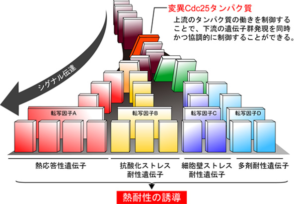 同定した変異を導入した再構成株は高温下において良好な生育を示し、さらに、野生株と比較してグルコースから2.5倍、ガラクトースから5.1倍のエタノールを生産しました。これらの変異は CDC25 遺伝子という、さまざまなストレス耐性を誘導する経路の上流に位置する因子において同定されました。再構成した株は、真核生物ではこれまで制御が困難であった種々のストレス応答性遺伝子を協調的に発現誘導することで、熱耐性を実現していることがわかりました。この熱耐性株を用いた有用物質生産では、発酵系の冷却エネルギーの削減、発酵速度の向上などが見込まれます。本研究で同定された熱耐性関連変異は低コストなバイオエタノール生産など、酵母の産業利用への広汎な応用が期待されます。