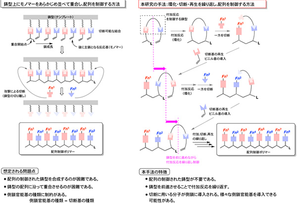 本研究グループは、高分子の長さ制御に有効な「リビングラジカル重合」法と、環状化合物が非環状化合物に変化する環化反応を用い、繰り返し単位の配列制御が可能な合成手法を開発しました。