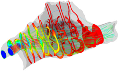 チンパンジーの鼻腔の気流と温度変化のシミュレーション:: 線は気流(青から赤にかけて速さが増す)、断面は温度分布(青から赤にかけて温度が増す)を表す。 詳しい研究内容について