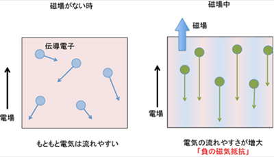 磁気抵抗効果は、磁性を利用したハードディスクなどさまざまな場面で応用されており、大きな磁気抵抗効果を示す新物質の探索を含めて精力的に研究が行われています。また、負の磁気抵抗効果は磁性材料や不純物半導体などで観測されています。一方、非磁性で導電性が良い物質(伝導電子が豊富にある金属類)では、磁場をかけると物質内の伝導電子が衝突しあって抵抗が増加する「正の磁気抵抗効果」が見られますが、このような物質群で大きな負の磁気抵抗効果が観測されたことがありませんでした。