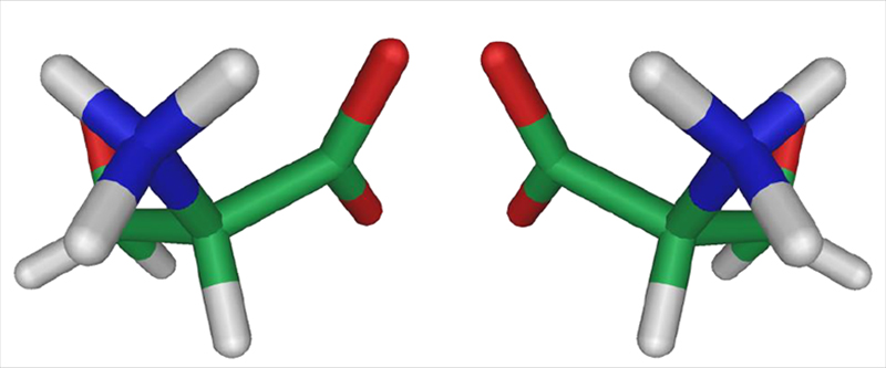 図:アミノ酸の1種、セリンのL体(左)とD体(右)