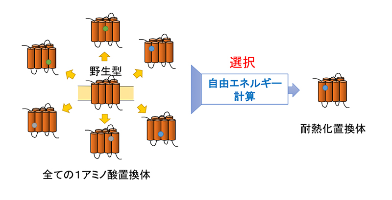 タンパク質内のアミノ酸残基を他のアミノ酸に置換することで、タンパク質が耐熱化し得ることが知られており、本研究では、膜タンパク質を耐熱化させ立体構造を崩れ難くするアミノ酸置換を理論的に予測する手法の開発に取り組みました。