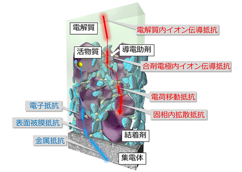 携帯電話、ノートパソコンで用いられているリチウムイオン電池は電気自動車用途への展開が期待されており、その性能を劇的に向上させる必要があります。リチウムイオン電池の設計には数多くのテクノロジーが組み込まれている一方で、性能向上のためにはトライ&エラーの開発要素も多いのが現状です。本研究では、複雑な電池内部の構造を解析する技術を用いて、電池性能の支配因子を明らかにしました。将来のリチウムイオン電池のさらなる性能向上へ役立てられると期待されます。