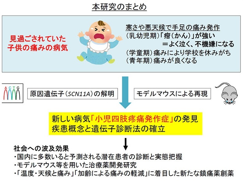 また、本研究により、乳幼児期に始まる手足の痛み発作の原因が特定され、疾患として新たに確立することができ、この病気を「小児四肢疼痛発作症」(Infantile episodic limb pain)と命名しました。